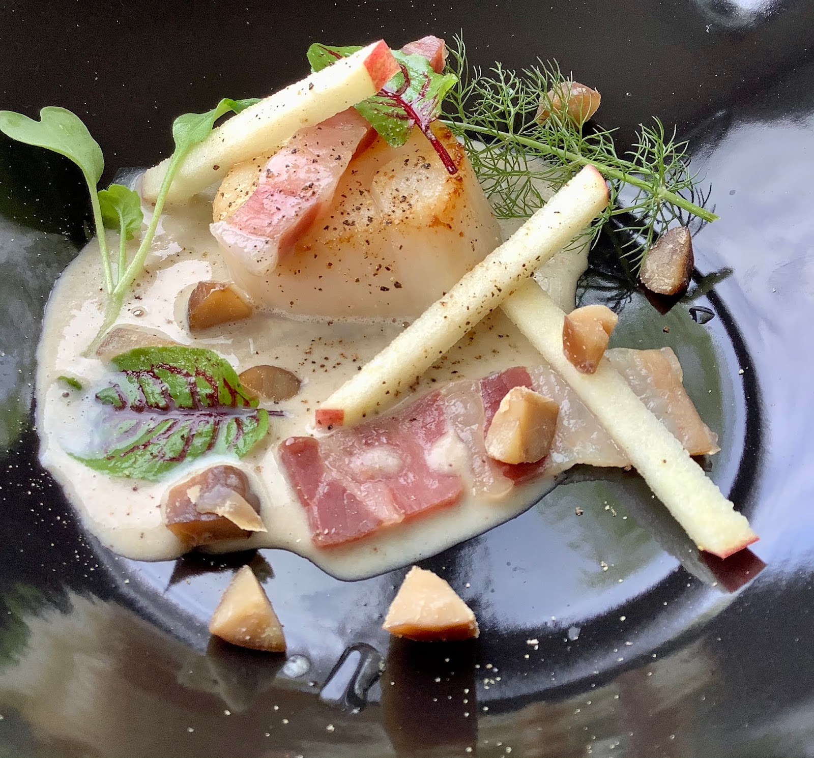 Roast scallops with chestnut velouté, maple syrup, apple and pancetta Recipe https://sweetteabiscuits.blogspot.com/2020/05/roast-scallops-with-chestnut-veloute.html
